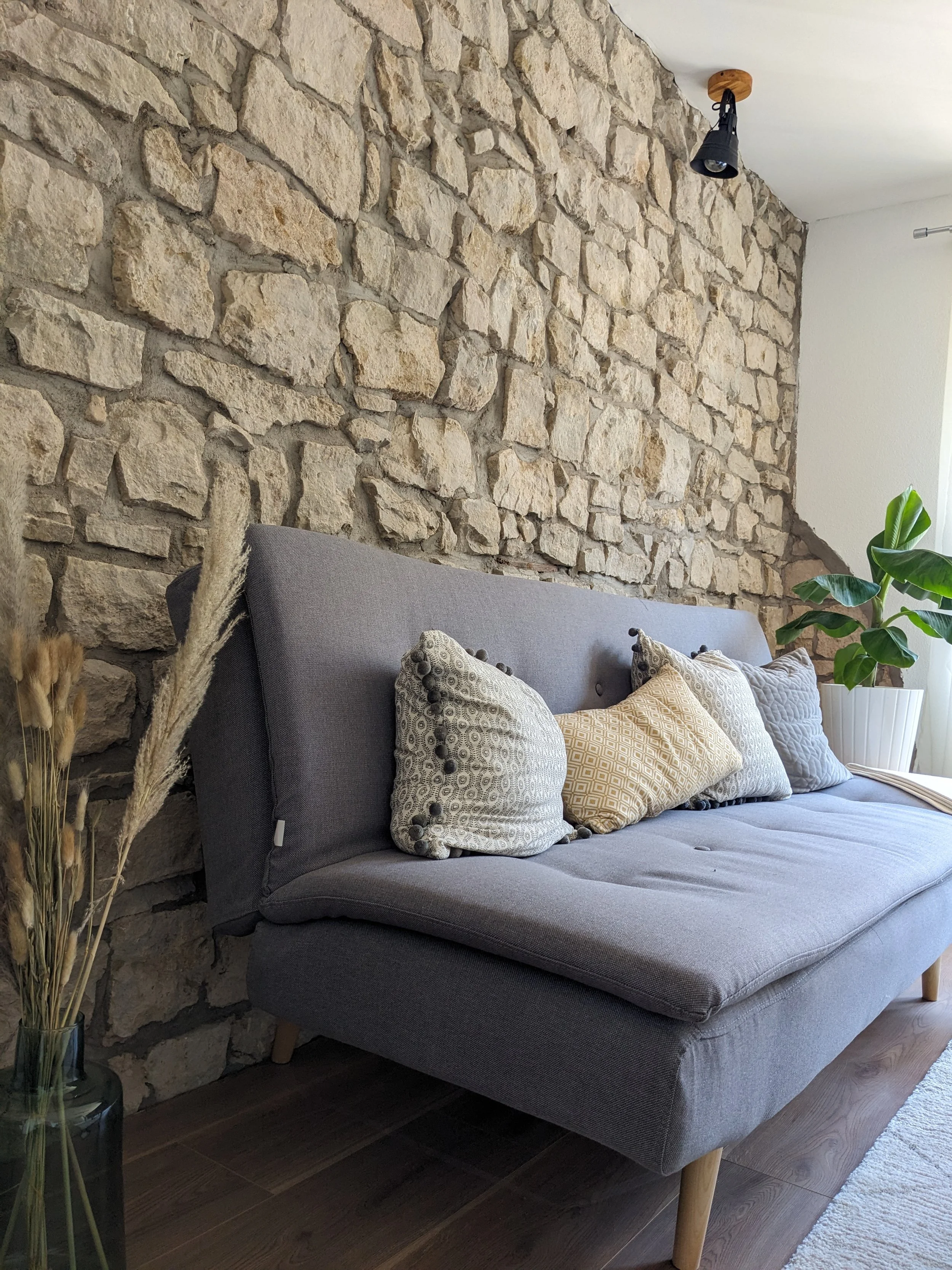 In 200 Jahre alten Mauern findest du modernes Design. Die freigelegte Bruchsteinmauer und der Fachwerk Holzbalken setzen spannende Akzente und schaffen ein entspanntes Ambiente, dass durch das Industrial Design aufgebrochen wird. Eine 3- Sitzer Couch und der gemütliche Sessel dienen als Sitzgelegenheit für angenehme Stunden.